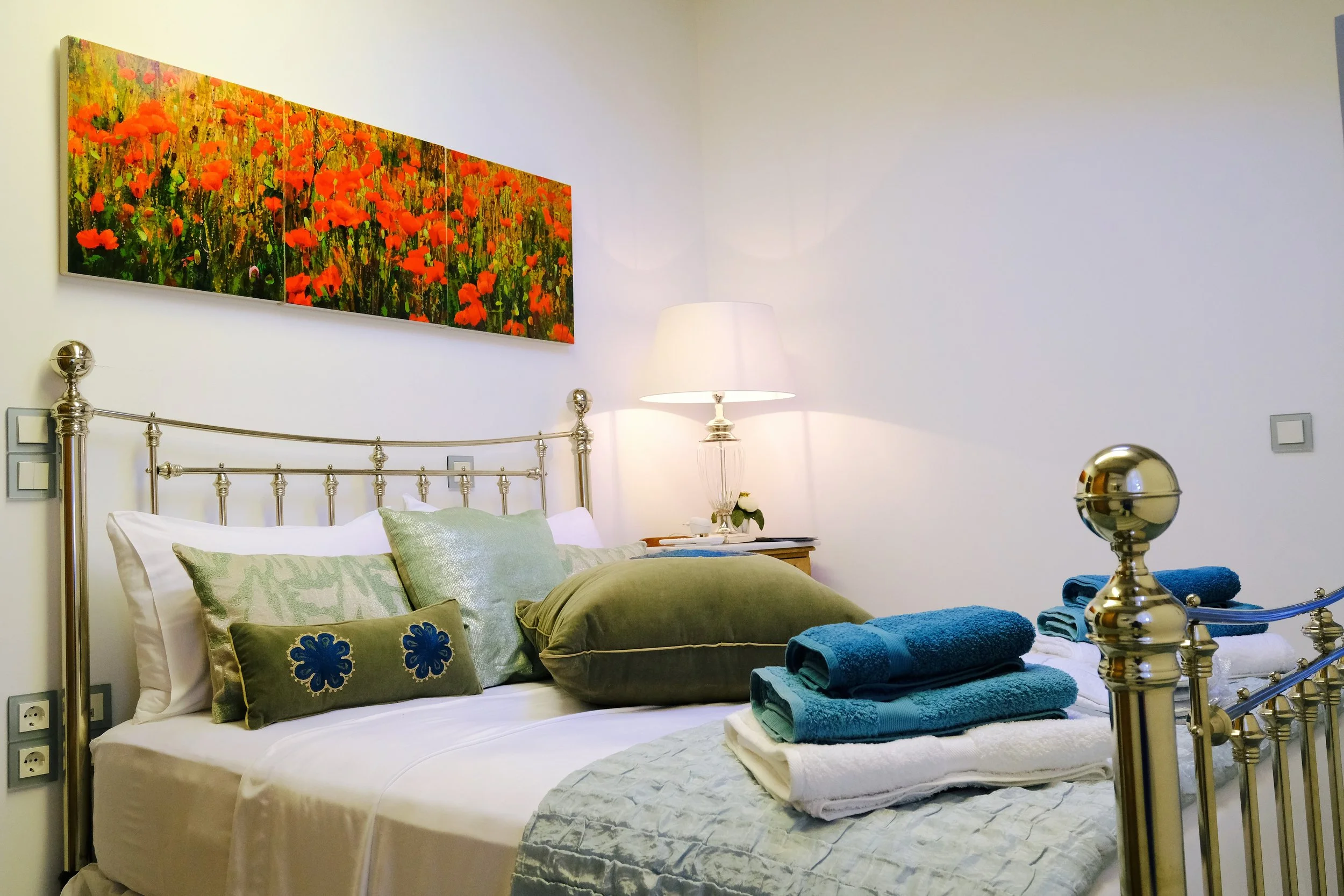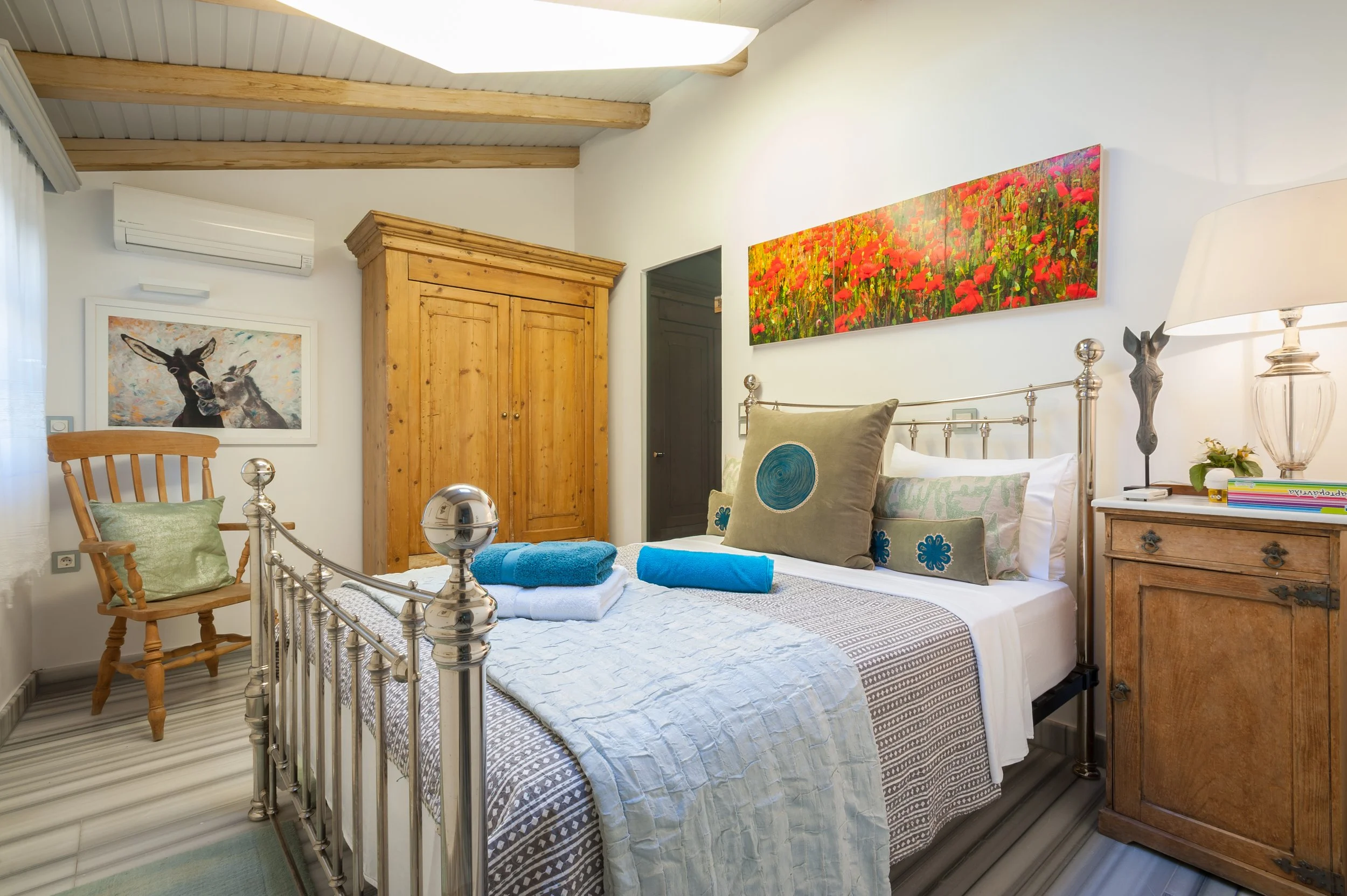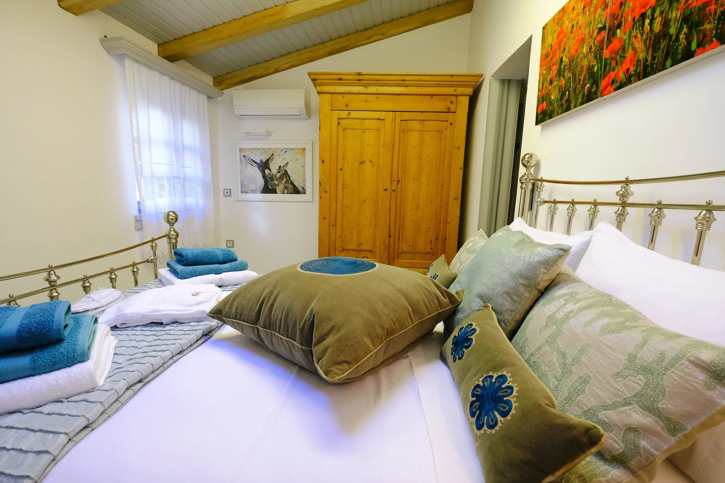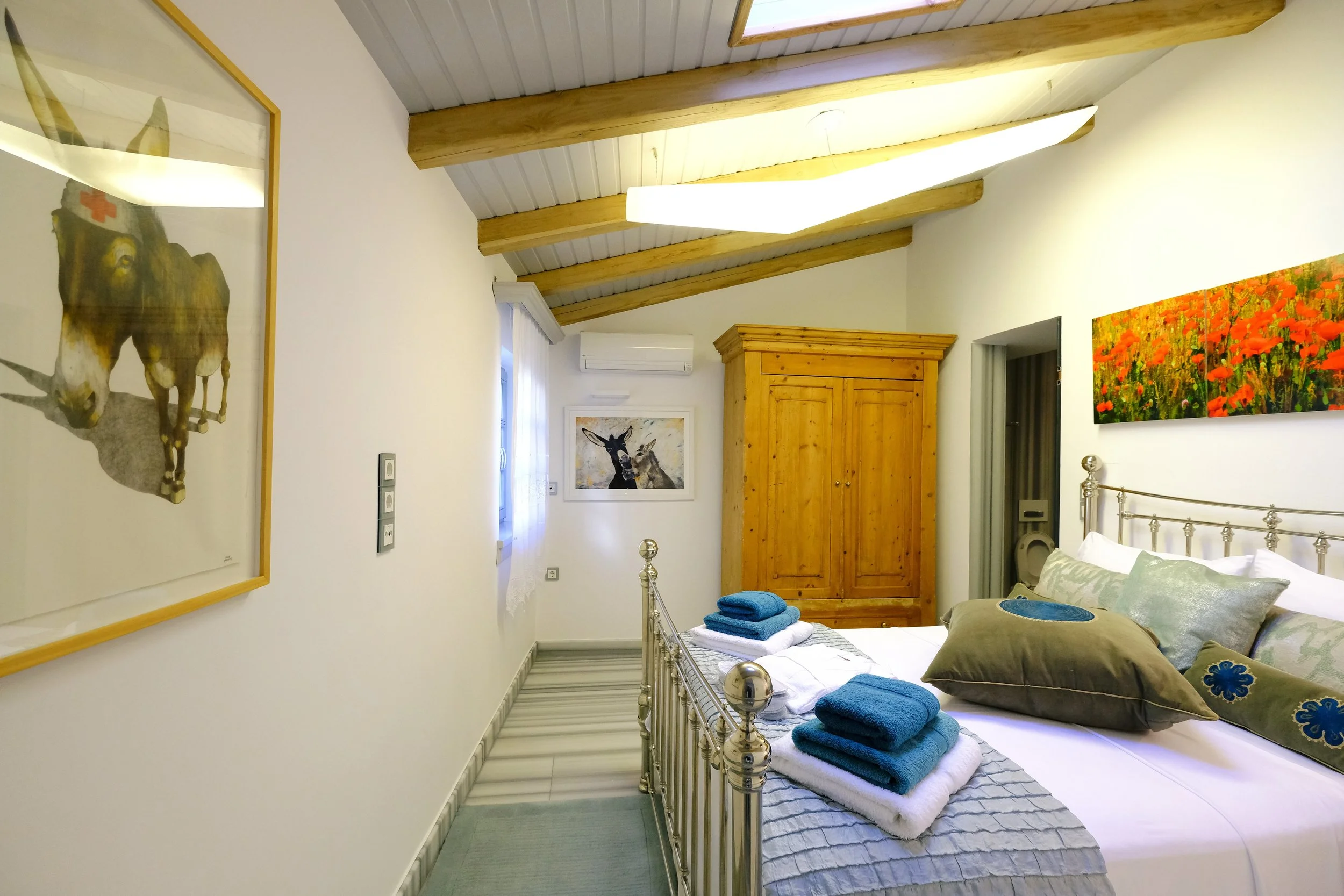 The Rosemary Room has a double size bed and en-suite shower and WC is situated on the ground floor of the Townhouse with access to the communal areas of the property – a secluded courtyard, a utility on the first floor (with coffee and tea making appliances, ice machine and laundry facilities) and a roof terrace, the perfect location for a morning coffee or pre-dinner drinks, offering panoramic views of Myrina bay and the Venetian fortress.